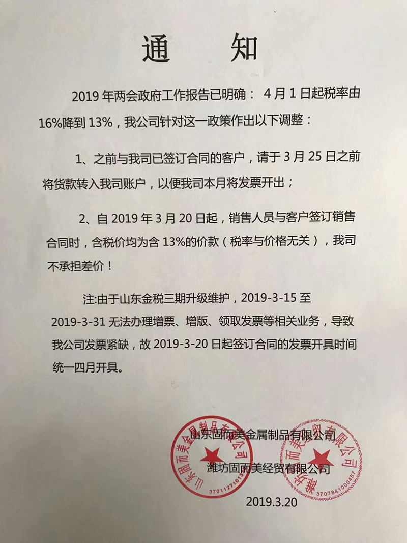 【重要通知】關(guān)于19年兩會提出的稅率調(diào)整情況,我司調(diào)整如下