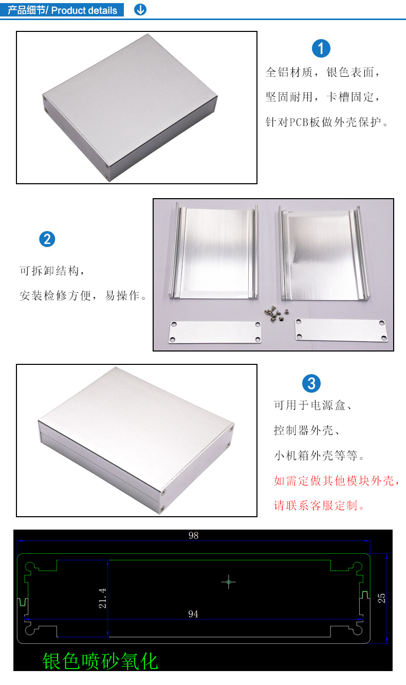 特點(diǎn):1.全鋁材質(zhì),銀色表面,堅(jiān)固耐用,卡槽固定,針對(duì)PCB板做外殼保護(hù)。